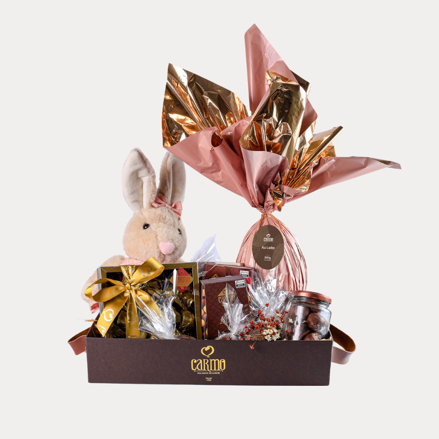 01 Pelúcia, 01 Ovo de 330g ao leite ou 01 trufado de 1kg, 02 Barras Recheadas (110g cada), 01 Caixa com 12 trufas sabores variados, 01 Drágeas de Castanha, 01 Pote de Gotas de Oreo, 01 Pote de Tubettes de Chocolate, 01 Caixa Coelhinho com chocolates doce de leite com oreo, 05 ovinhos de 30g ao leite.