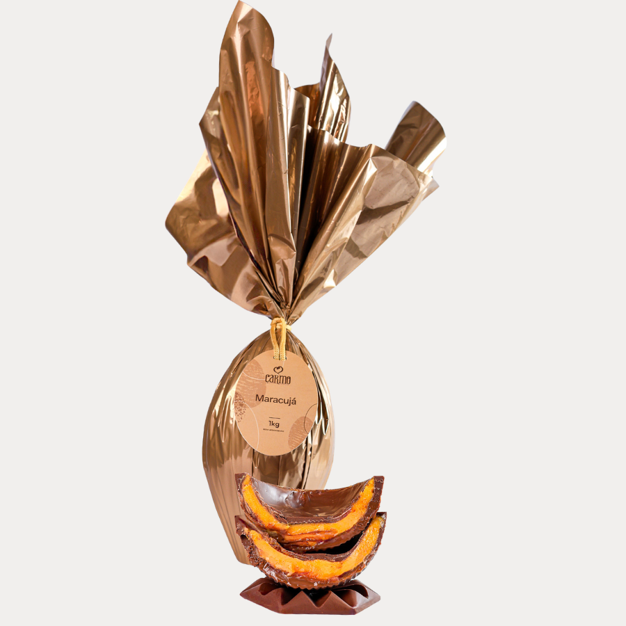 Ovo de chocolate ao leite recheado com brigadeiro de maracujá.